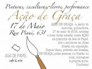 Nesta quinta-feira (17), a partir de 12h, artistas e suas obras estarão nesta Ação de Graça na pracinha da rua Piauí, 631, perto de onde funciona o espaço Asa de Papel Café & Arte. Não, não é nenhum ato religioso, mas sim uma ação entre artistas de diversas áreas, que irão ocupar uma praça em Belo Horizonte.