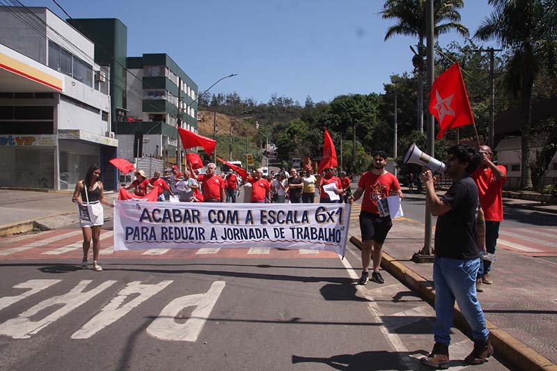 Os manifestantes itabiranos também exibiram uma faixa pedindo o fim da escala de trabalho 6×1, um modelo que compromete o direito ao descanso, à convivência familiar e ao ócio criativo, que são fundamentais para a dignidade do trabalhador