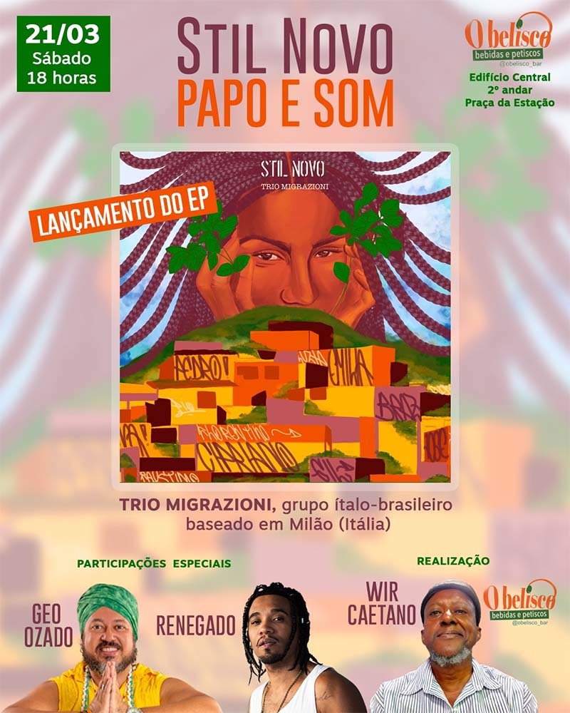 No Dia Internacional de Combate à Discriminação Racial, 21 de março, a partir das 18 horas, o letrista Wir Caetano e o bar O Belisco promovem o lançamento do EP autoral “Stil Novo”, do Trio Migrazioni. O estabelecimento fica no segundo andar do Edifício Central, na Praça da Estação, em Belo Horizonte.