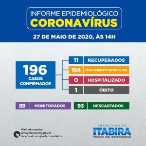 Até quarta-feira (27), 1.552 pessoas foram testadas em Itabira, com registro de 196 casos confirmados para a Covid-19, conforme consta no último boletim epidemiológico divulgado pela assessoria de imprensa da Prefeitura na tarde de ontem.