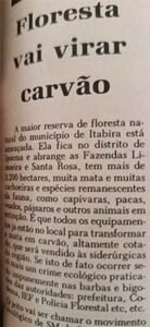 Foi com esse comentário que o jornal Cometa Itabirano, em sua edição de janeiro de 1989, com base em informações de moradores do distrito de Ipoema, noticiou e alertou as autoridades para a iminência desse crime, que mais uma vez se cometeria no mesmo local e objetivo: transformar a mata em carvão vegetal para suprir os altos-fornos das siderúrgicas da região.