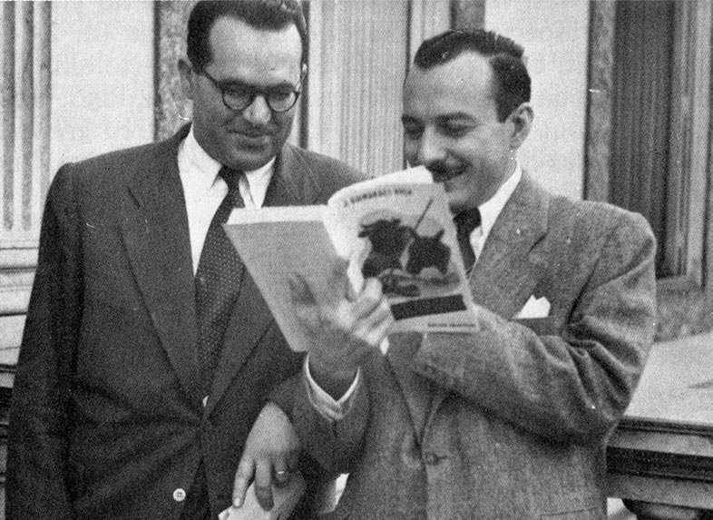João Guimarães Rosa ao lado de João Condé, esse último segura o primeiro exemplar publicado de Sagarana |Data atribuída: Abril de 1946