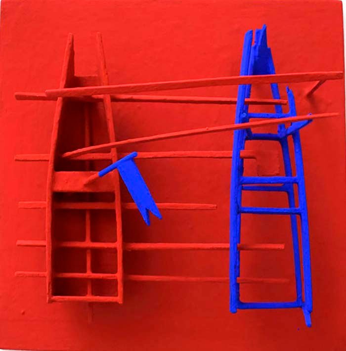 Em Reconstrucción en Azul, dois barcos se sobrepõem em equilíbrio tenso, como se estivessem suspensos no tempo. A escolha da madeira leve e dos pigmentos intensos em azul e vermelho remete ao sagrado, ao infinito, ao céu e ao mar.
