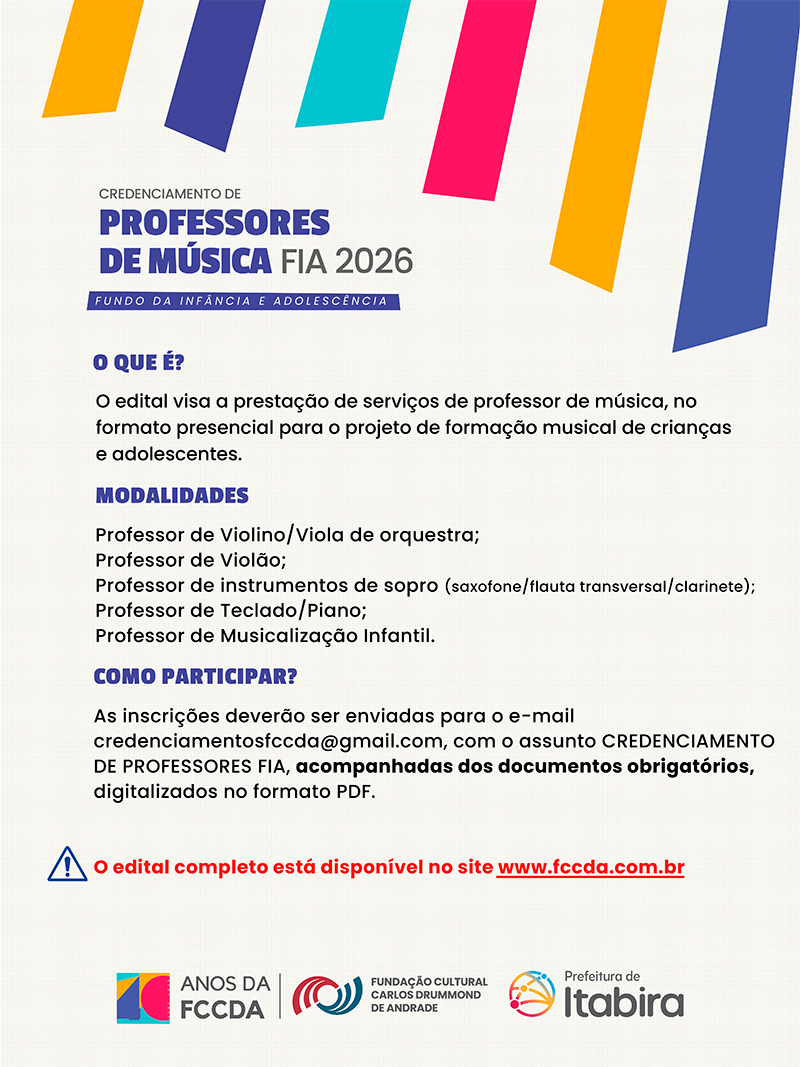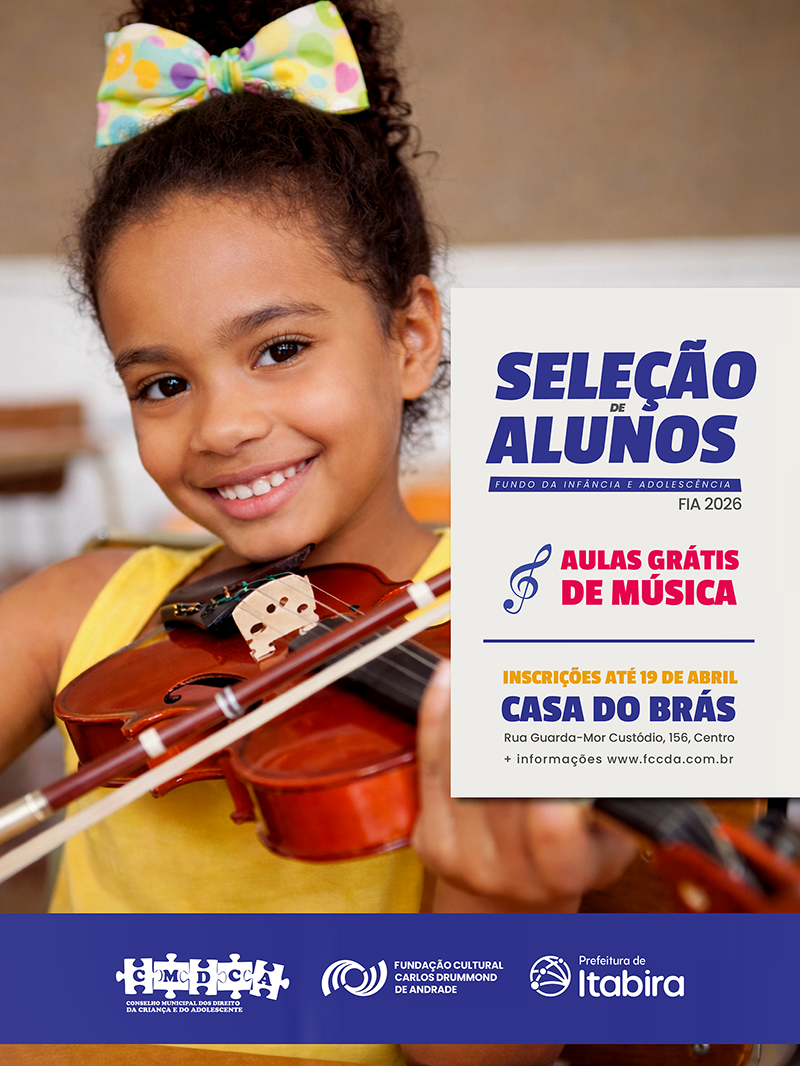 A Fundação Cultural Carlos Drummond de Andrade (FCCDA) está com inscrições abertas para o processo seletivo de novos alunos do Projeto FIA – Música, voltado à iniciação musical de crianças e adolescentes em Itabira.