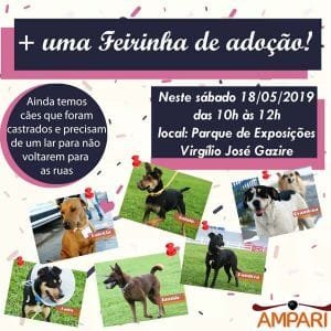 A Associação de Moradores e Protetores dos Animais da Região de Itabira (Ampari) avisa aos interessados que no sábado (18), no horário de 10h às 12h, no parque de exposições Virgílio Gazire, haverá feirinha de adoção de cães castrados – uma oportunidade para se ter um animal saudável, retirando-o das ruas.