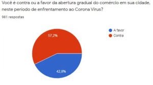 E, ainda, 57,1% se posicionaram contrários à abertura gradual do comércio, rechaçando assim a tentativa da Câmara dos Dirigentes Lojistas (CDL) de reabrir os estabelecimentos não essenciais na cidade.