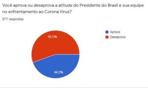 Entre os entrevistados pelo DataMG, 71,8% desaprovam as atitudes do presidente Bolsonaro, contrárias às medidas restritivas. Contudo, as suas atitudes irresponsáveis ainda obtiveram o apoio de 44,4% dos entrevistados, contrariando o sentimento geral, manifestado na mesma pesquisa, de acerto das medidas restritivas.