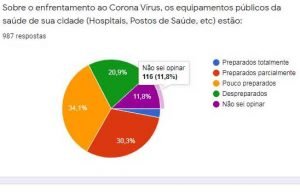 Quanto ao aparelhamento dos serviços de saúde (hospitais, Pronto-Socorro, PSFs) para o enfrentamento do coronavírus, a maioria (34,2%) considera que estão bem preparados, 11,6% não souberam opinar, enquanto apenas 2,9% acreditam que estão preparados totalmente.