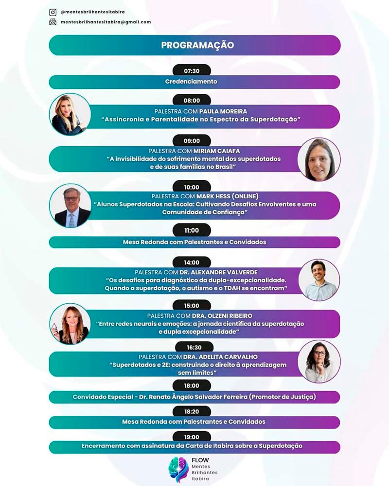 A programação inclui palestras, mesas-redondas e um momento de destaque: a assinatura da Carta de Itabira sobre Superdotação, documento que servirá de base para futuras políticas públicas voltadas à inclusão e ao reconhecimento da neurodiversidade.