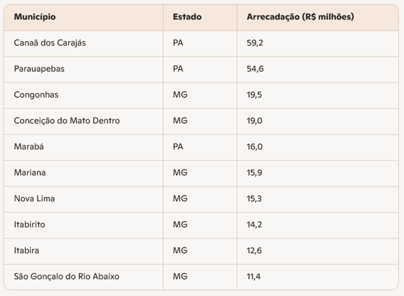 Minas Gerais, portanto, não apenas lidera entre os estados, mas também concentra grande parte dos municípios que figuram entre os maiores arrecadadores do país, como Congonhas, Conceição do Mato Dentro, Mariana, Nova Lima, Itabirito e Itabira.