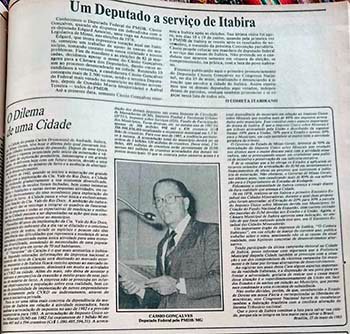 Conheci Cássio Gonçalves em 1978, quando se candidatou a deputado estadual, fazendo dobradinha com o então deputado federal Edgar Amorim (in memoriam). Posteriormente, nós, do jornal O Cometa, o apoiamos para deputado federal, quando se elegeu em 1982, obtendo 2.500 votos em Itabira.