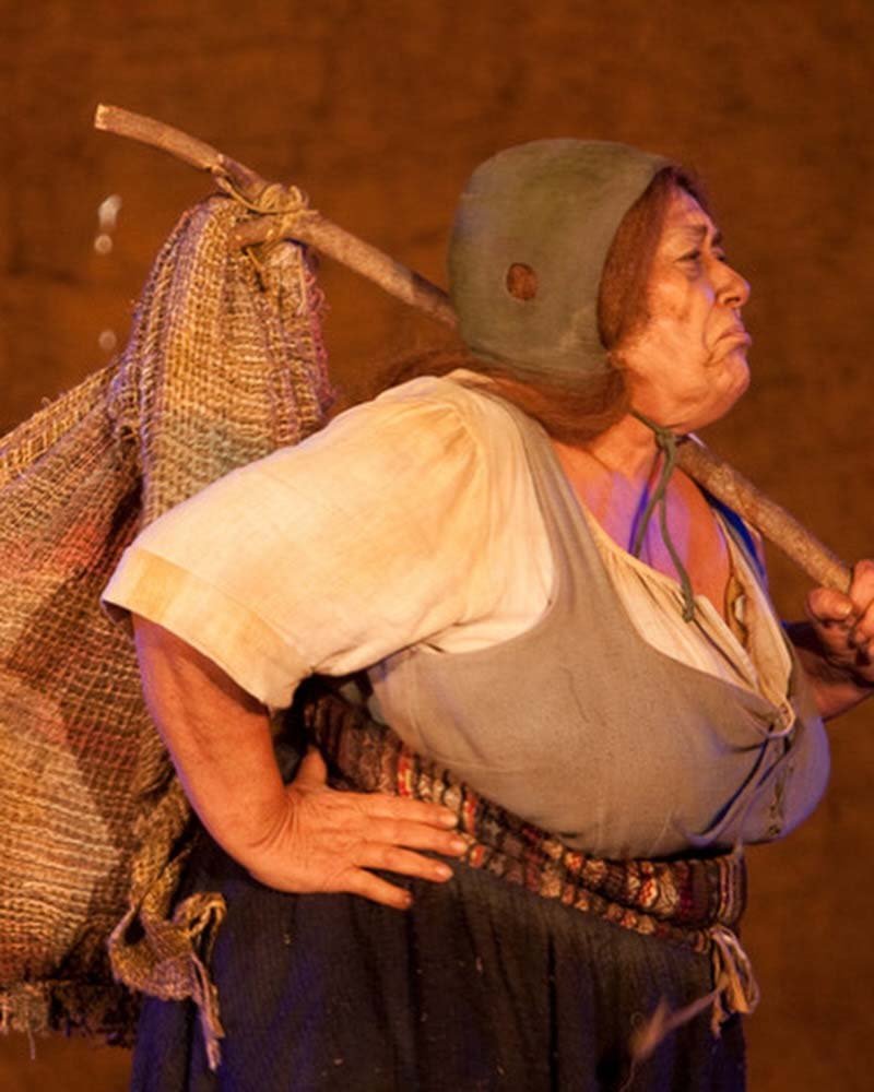 Teuda Bara em cena com o grupo Galpão na montagem de Romeu & Julieta, dirigida por Gabriel Villela em 1992, inspirada em William Shakespeare, com figurinos rústicos e estética mambembe, como nesta imagem que evoca o sertão mineiro e o teatro de rua