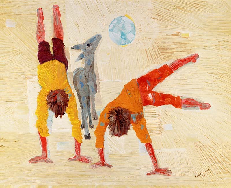 No destaque, Meninos Brincando, obra de1955, retrata a brincadeira de dois meninos plantando bananeira perto de um burrinho