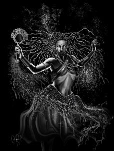 Iemanjá, doçura do mar, emerge das águas, qual peixe luminoso. Traz no pescoço o colar do Ano Novo. As contas são brancas, com entremeio de sete azuis e sete douradas.