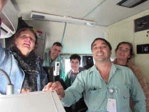 Francislayne na cabine do trem, com ferroviários (Fotos: Eduardo Cruz)