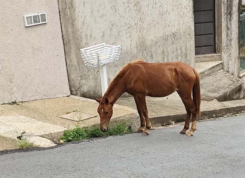 Cavalo solto se alimenta de mato em rua urbana de Itabira. A vegetação atrai animais, aumenta riscos e precisa ser urgentemente capinada