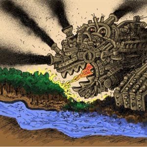 Some-se ainda o prejuízo ecológico, sociedades comerciais dominadas de fora, impondo recorrentes retrações pelas firmas “tubarão-grande”; igual a falsa expansão seguindo exaustão, dando instabilidade ao sistema. É isso, tal como no passado até ao estoiro econômico, depois entrada em força da “crise estimulante”, transformadora do capital retido na fonte mas pertença social, acaba sempre sobrando no pagamento das gigantescas e absurdas dívidas de trilhões desviados ou mal-parados em bancos da ordem fugitiva. Mais uma vez, enchendo bolsos da elite dominante: depois, subindo ao palco, a minoria raspando fundos do tacho que deveria ser de todos.