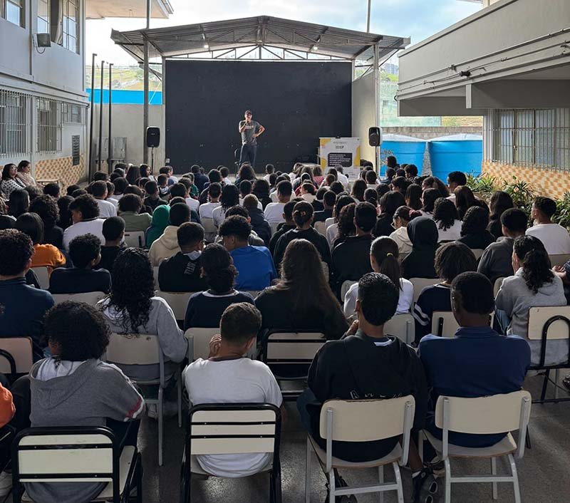 “A gente não foi só pra ouvir, mas pra pensar em como transformar nossas próprias histórias em oportunidades. Foi tipo uma faísca que acende dentro”, relata Ana Clara Ferreira, aluna participante do projeto na Escola Estadual Mestre Zeca Amâncio.
