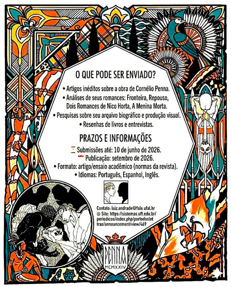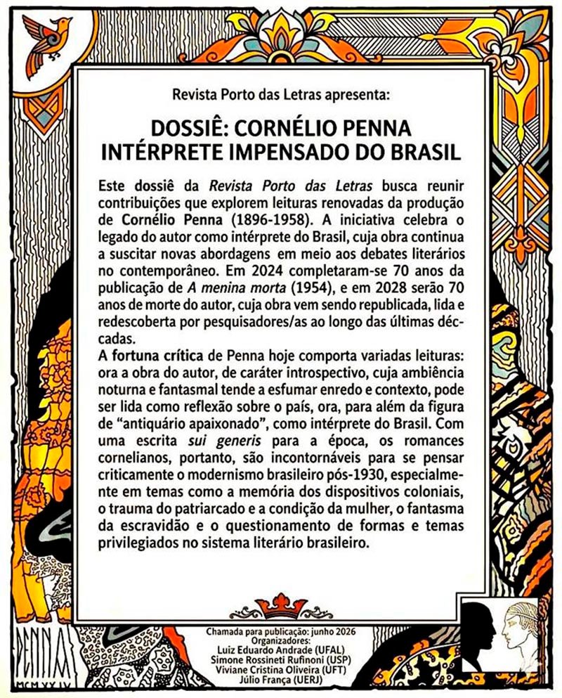 A Revista Porto das Letras, vinculada ao programa de Pós-Graduação em Letras da Universidade Federal do Tocantins (UFT), anuncia a chamada pública de artigos para o dossiê Cornélio Penna: Intérprete Impensado do Brasil, com prazo de inscrição e apresentação até 10 de junho de 2026 e publicação prevista para setembro deste ano.