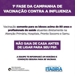 Tem início nesta segunda-feira (23) a campanha nacional de vacinação contra a gripe (influenza). Em Itabira, a vacinação ocorre nas unidades de saúde dos bairros – e também na Policlínica Municipal, na Vila Piedade. A campanha de imunização vai até 22 de maio, de acordo com cronograma a ser divulgado pelo Secretaria Municipal de Saúde (SMS).
