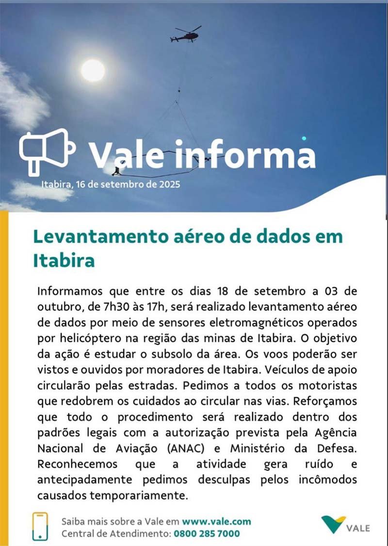 Desde o dia 18 de setembro, a Vale realiza um novo levantamento geológico na região das minas de Itabira, utilizando helicópteros equipados com sensores eletromagnéticos. Segundo comunicado da empresa, os voos ocorrem diariamente, das 7h30 às 17h, e devem se estender até 3 de outubro. O objetivo declarado é estudar o subsolo da cidade em busca de novas reservas minerais.