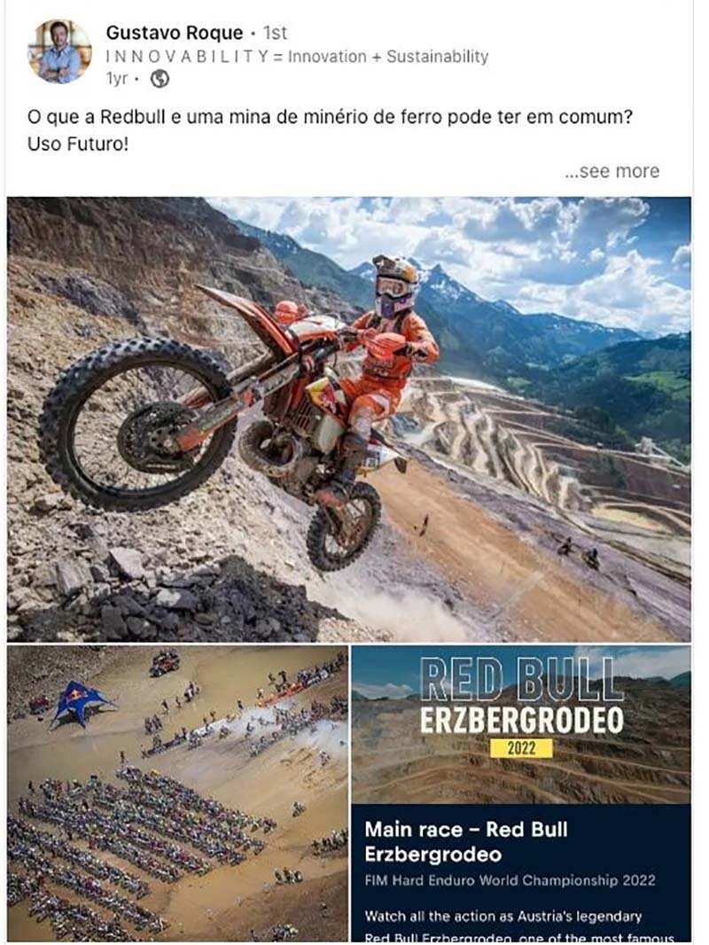 “O que a Red Bull e uma mineradora de minério de ferro têm em comum? Uso futuro”, ele escreveu, sugerindo a disponibilização de áreas nessas condições para esse tipo de competição esportiva – uma atividade poluente, sazonal e sem retorno social consistente.