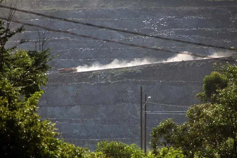 Caminhão fora-de-estrada levanta poeira na estrada da mina – sinal de que o sistema de irrigação não está funcionando bem em Itabira