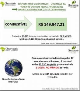 O gasto total com combustível no período foi de R$ 149,9 mil. O vereador campeão em gasto nesse quesito foi o único presente na reunião de apresentação do relatório pelo OSBI. Reginaldo das Mercês Santos (PTB) gastou R$ 11,2 mil com combustível e mais R$ 15,2 mil com aluguel de veículo.